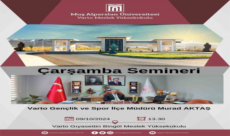 Seminerde üniversite öğrencilerine Varto Gençlik ve Spor İlçe Müdürlüğünün tanıtımı yapılarak, yürütülen faaliyetler, kurslar ve gençlik merkeziyle ilgili bilgiler verildi. Konu ile ilgili açıklamalarda bulunan Varto Gençlik ve Spor Müdürü Murat Aktaş, “Öğrenci kardeşlerimizin spor branşlarına ilgisi bizleri mutlu etti. Üniversite öğrencilerimizle ‘Çarşamba Semineri’nde buluşmamızı sağlayan herkese teşekkür ederim” dedi.