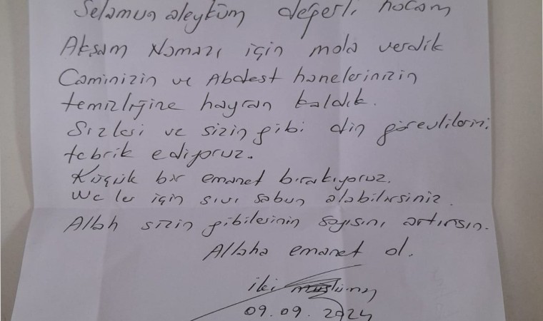 Narman İlçe Müftülüğüne bağlı Çimenler Mahallesi Camii’nde akşam namazını kılan iki vatandaş, namazdan sonra cami imamına teşekkür notu bıraktı. Cami ve lavaboların temizliğini beğendikleri anlaşılan vatandaşların, İmam Hatibin rafta duran sarığına dayalı halde bıraktıkları notta, "Selamün Aleyküm değerli Hocam, akşam namazı için mola verdik. Caminizin ve abdesthanelerinizin temizliğine hayran kaldık. Sizleri ve sizin gibi din görevlilerini tebrik ediyoruz. Küçük bir emanet bırakıyoruz. WC’ler için sıvı sabun alabilirsiniz. Allah sizin gibilerin sayısını artırsın. Allah’a emanet ol. İki Müslüman." ifadeleri yer aldı.