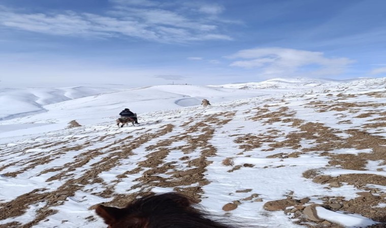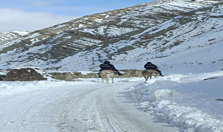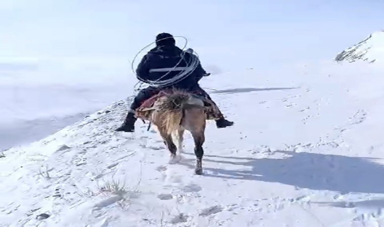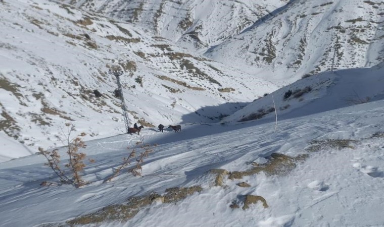 Soğuk havada atlarla dik dağlarda ilerlemekte zorlanan ekipler, bir süre sonra olumsuz hava şartlarına rağmen direkteki hatta oluşan arızayı onardı.