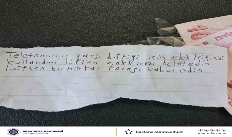 Atatürk Üniversitesi Araştırma Hastanesi'nde yaşanan duygusal bir olay hastane yönetimi tarafından sosyal medya hesaplarından paylaşıldı. Telefonu şarjı biten bir vatandaşın hastane elektriğini kullanarak telefonunu şarj ettiği, ardından bir miktar para ve not bıraktığı belirtildi. Notunda "Telefonumun şarjı bittiği için elektriğinizi kullandım, lütfen hakkınızı helal edin. Lütfen bu miktar parayı kabul edin." ifadelerinin yer aldığı vatandaşın bu davranışı hastane yönetimi tarafından takdir edilerek teşekkür edildi. Bu tür fedakarlık ve sorumluluk duygusu içeren davranışların toplumun dayanışma ve değerlere olan inancını güçlendirdiği vurgulandı.