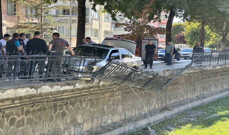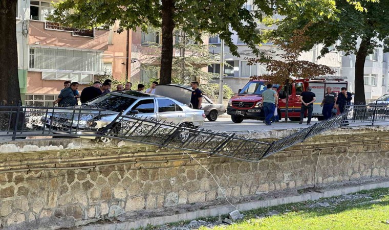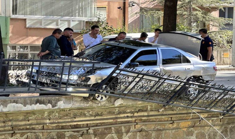Kastamonu’da virajı alamayan otomobil, kaldırıma çıkarak önce ağaca çarptı, ardından dere kenarında bulunan demir korkuluklara çarparak asılı kaldı.