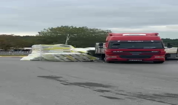 Kocaeli-İstanbul sınırında virajı alamayan tırın dorsesinde taşıdığı yükler yola saçıldı.