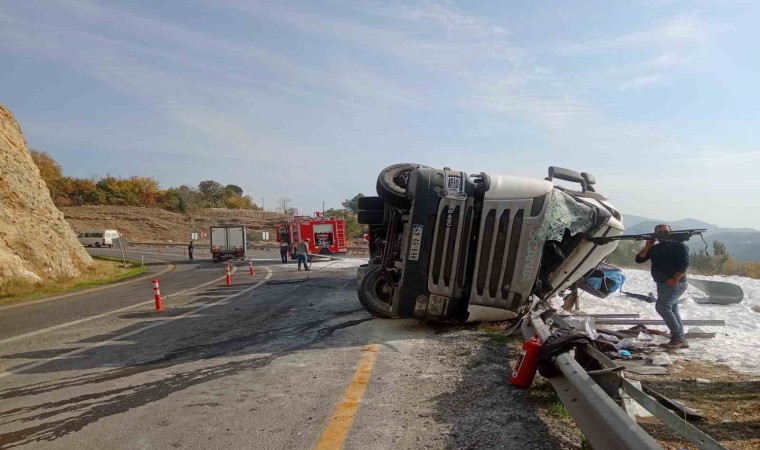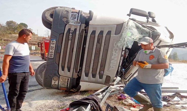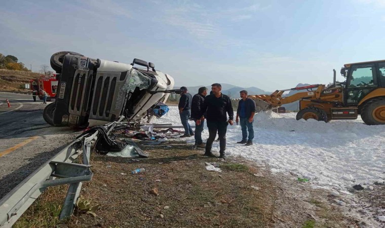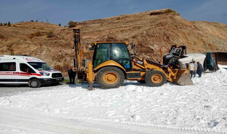 Elazığ’da virajı alamayan tuz yüklü tır devrildi. Kazada ortalık beyaza bürünürken kupa içerisinde sıkışan sürücü, ekipler tarafından çıkartıldı.