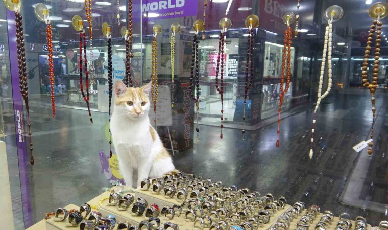 Mersin Çarşısı’nda 25 yıllık esnaf Adem İnan’ın işlettiği gümüş takı tasarım dükkanında vitrini gümüş takıların yanı sıra aralarında gezen kediler de de süslüyor. İnan iş yerinde beslediği kediler vitrinde de gezerek müşterilerin ilgisini çekiyor. ’Prens’ adlı sarman cinsi kedi ile ’Gümüş’ adlı smokin cinsi kedi gün boyu vitrinlerde dolaşarak, müşterilere neşe katıyor.