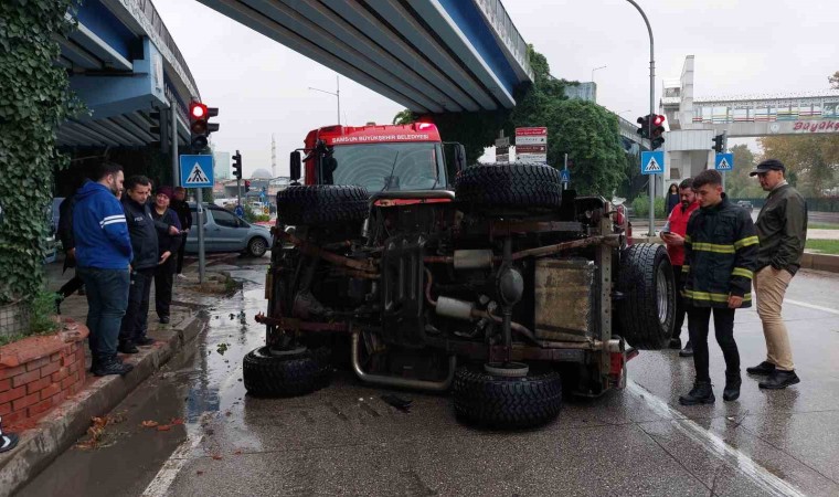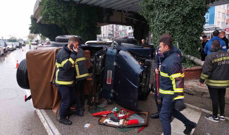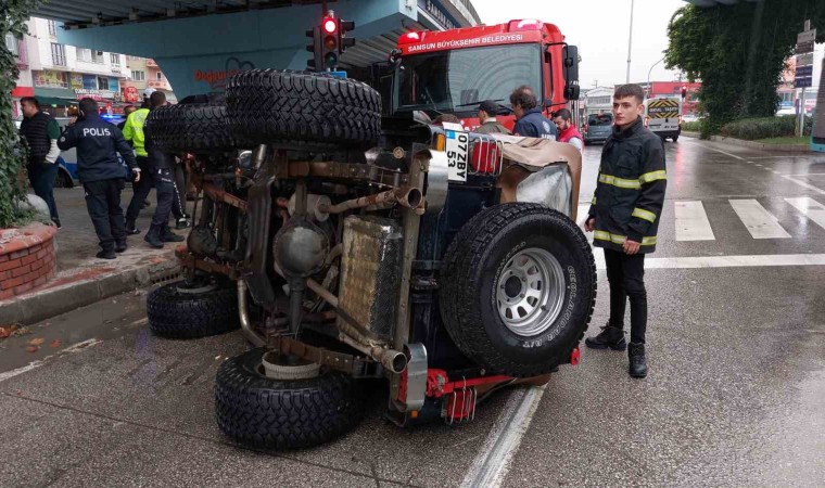 Samsun’da viyadük ayağına çarpan cip yol oryasına devrilirken, cip sürücüsü üniversite öğrencisi genç kazayı yara almadan atlattı.