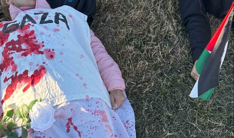 ABD’nin başkenti Washington DC’de “Özgür Filistin” gösterisi yapılırken, göstericiler İsrail’i temsili kana bulanmış ve kefenlenmiş cansız bedenlerle protesto etti.