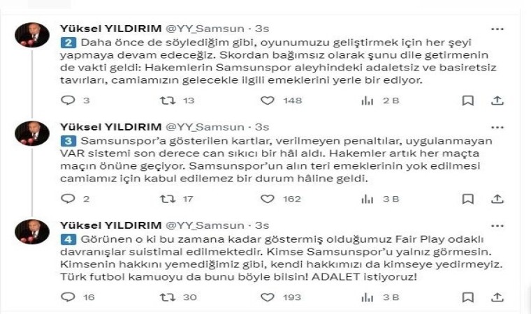 SAMSUN (İHA) – Y. Samsunspor ve Başkan Yüksel Yıldırım, yazılı açıklama ile hakem hatalarına tepki göstererek, adalet vurgusu yaptı.