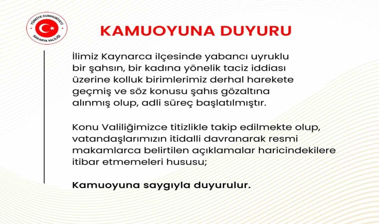 Konuya ilişkin Sakarya Valiliği’nden yapılan yazılı açıklamada, “İlimiz Kaynarca ilçesinde yabancı uyruklu bir şahsın, bir kadına yönelik taciz iddiası üzerine kolluk birimlerimiz derhal harekete geçmiş ve söz konusu şahıs gözaltına alınmış olup, adli süreç başlatılmıştır. Konu Valiliğimizce titizlikle takip edilmekte olup, vatandaşlarımızın itidalli davranarak resmi makamlarca belirtilen açıklamalar haricindekilere itibar etmemeleri hususu kamuoyuna saygıyla duyurulur” ifadeleri yer aldı.