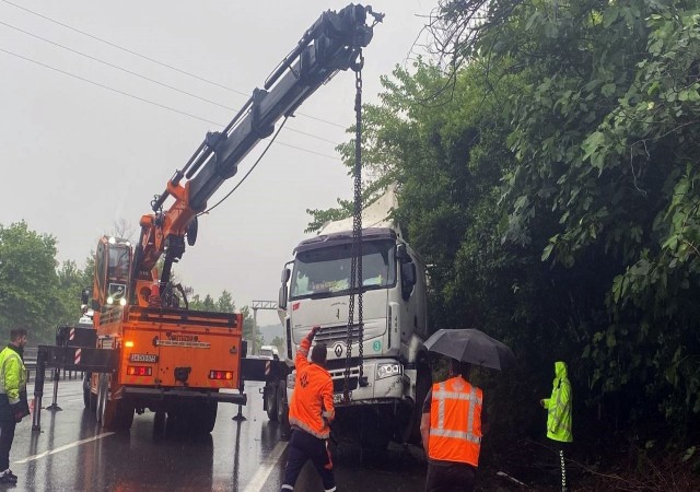 TEM OTOYOLU SAKARYA GEÇİŞİNDE YAĞIŞ KAZAYI BERABERİNDE GETİRDİ. YAĞIŞIN ETKİSİ İLE KAYGANLAŞAN YOLDA KONTROLDEN ÇIKAN TIR MAKASLADI. KAZA SEBEBİ İLE OTOYOLDA UZUN ARAÇ KUYRUKLARI OLUŞTU