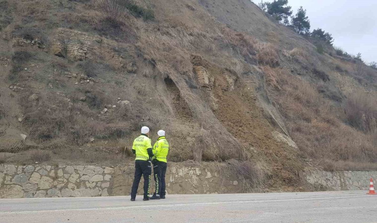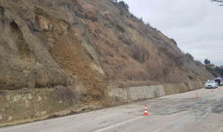 Karabük’te yağışların ardında karayolu üzerinde toprak kayması yaşanırken, araçlar kontrollü olarak geçiş sağlıyor.