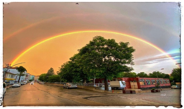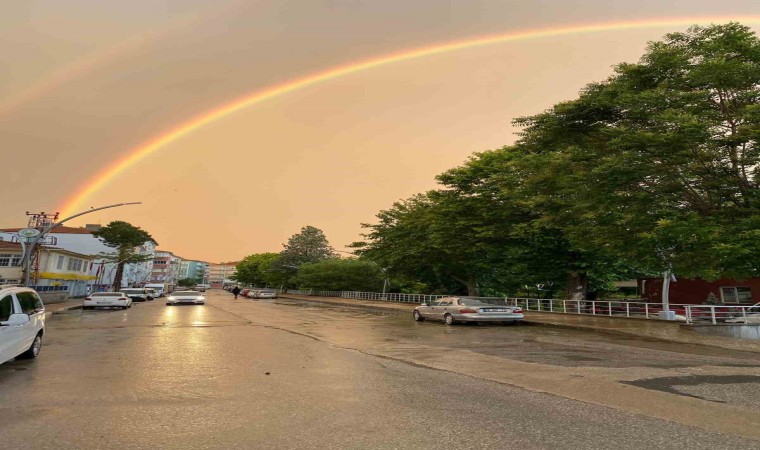 Çorum’un Sungurlu ilçesinde yağmur sonrası ortaya çıkan gökkuşağı görsel şölen sundu.