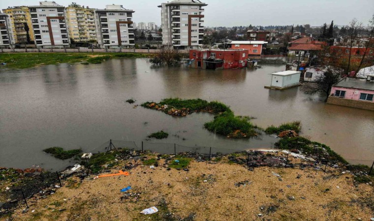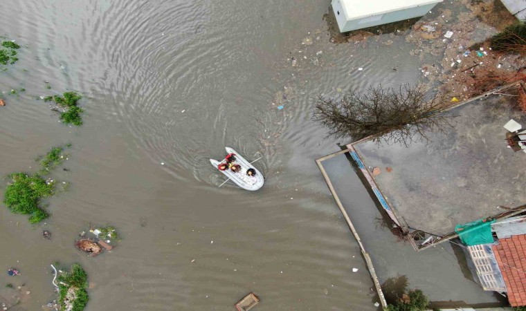 Drone ile görüntülen mahallede birçok ev kullanılamaz hale gelirken bazı araçların da su altında kaldığı görüldü.