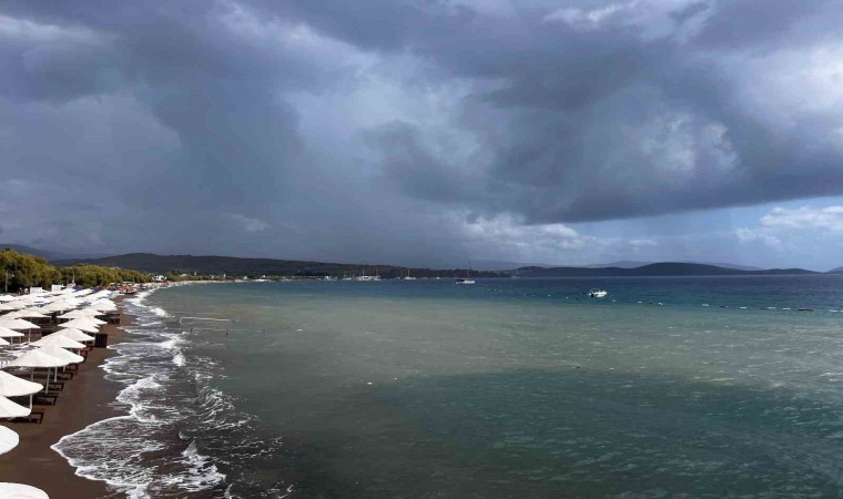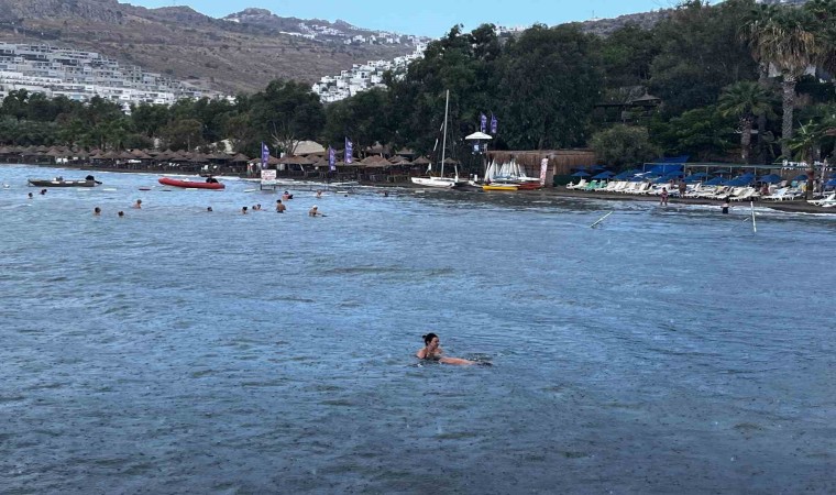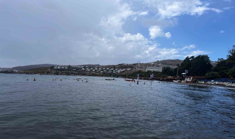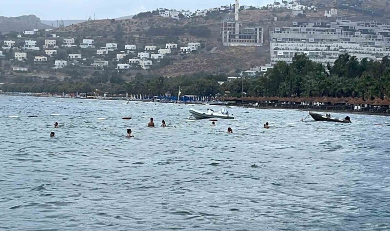 Muğla’nın Bodrum ilçesinde aniden bastıran yağmur denizin rengini değiştirdi. Yerli ve yabancı turistler ise yağan yağmur altında denize girerek keyifli vakit geçirdi. Sağanak yağışta denizin renginin de değiştiği görüldü.