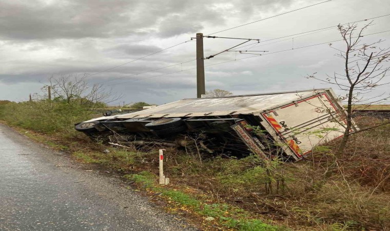 Tekirdağ’ın Muratlı ilçesinde yağmur nedeniyle kayganlaşan zeminde yoldan çıkarak devrilen kamyonetin sürücüsü, kazayı hafif sıyrıklarla atlattı.