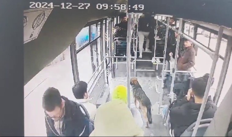 Karabük’ün Safranbolu ilçesinde sağanak yağmurdan kaçan bir sokak köpeği, seyir halindeki halk otobüsüne sığındı.