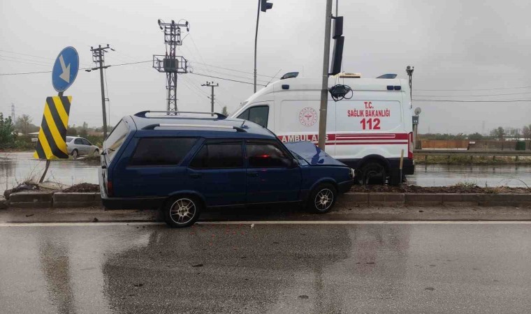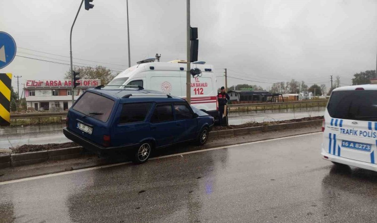 Bursa’nın Orhangazi ilçesinde İznik yolu Otoban kavşağında yağmur sebebiyle kayganlaşan yolda kontrolden çıkan otomobil, orta refüjdeki trafik lambasına çarparak durabildi.