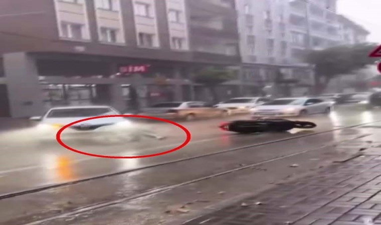 Bursa’da yağmurun şiddetini çeken vatandaşın önünde motosiklet ile araç çarpıştı. Kaza sonrası motokuryenin kafası aracın lastiğine çarptı, facia ucuz atlatıldı.