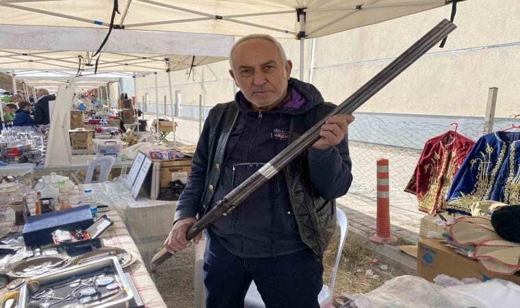 Eskişehir’de antikacılık yapan Fahri Şahin’in tezgahında sergilediği ve halen çalışır vaziyette olan 150 yıllık Belçika yapımı çiftli dolma tüfek görenlerin dikkatini çekiyor.