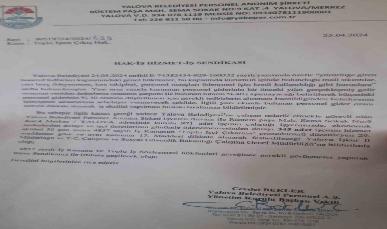 “Yalova Belediyesi, yürürlüğe giren tasarruf tedbirleri çerçevesindeki genel hükümler, bu çerçevede kurumun içinde bulunduğu mali sıkıntılar, cari borç ödeyememe, icra takipleri, personel maaşları ödenmesi için kredi kullanıldığı gibi hususlara’ atıfta bulunulmuştur. Yine aynı yazıda kurumun personel giderinin bir önceki yılın gerçekleşmiş gelir oranının yeniden değerleme oranının çarpımı ile bulunan tutarın yüzde 40’ı aşamayacağı belirtilmiştir. Bütçedeki personel giderinin yüzde 40 oranına düşürülmesi için gerekli tedbirlerin alınması istenildiğinden belediyenin işleyişinin aksamasına sebebiyet vermeyecek şekilde, ilgili yazı ekinde bulunan personel gider oranı cetveli dikkate alınarak iş eksilişi yapılması hususu tarafımıza bildirilmiştir. Bu sebeple ilgili kanun gereği sadece Yalova Belediyesi’ne çalışan tedarik etmekle görevli olan Yalova Belediyesi Personel Anonim Şirketi işveren unvanı ile Rüstem paşa Mah. Sema Sokak No:9 Kat:4 Merkez / Yalova adresinde kurulu 971 adet işçinin çalıştığı işyerimizde, ekonomik sebeplerden dolayı ve işçi ücretlerinin gününde ödenememesinden dolayı 345 adet işçinin hizmet akitleri 30 gün sonra 4857 sayılı İş Kanunun ’Toplu İşçi Çıkarma’ prosedürünü düzenleyen 29. maddesine göre ve aynı kanunun 17. Maddesi dikkate alınarak feshedileceği Yalova İş-Kur İl Müdürlüğü ve T.C. Çalışma ve Sosyal Güvenlik Bakanlığı Çalışma Genel Müdürlüğü’ne bildirilmiş olup; 4857 sayılı İş Kanunu ve Toplu İş Sözleşmesi hükümleri gereğince gerekli görüşmeler yapmak üzere sendikanız ile irtibata geçilecek olup, gereğini bilgilerinize rica ederiz."