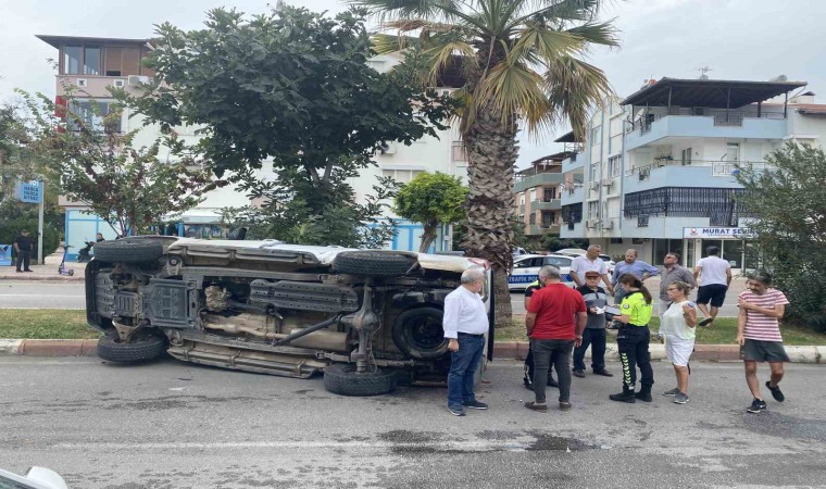 Antalya’da kontrolsüz kavşakta otomobil ile kamyonetin çarpışması sonucu meydana gelen kazada yan yatan kamyonetin sürücüsü kazayı yara almadan atlattı.