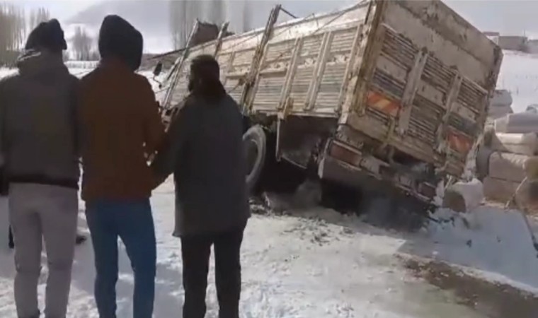 Van’ın Gürpınar ilçesinde yan yatan saman yüklü kamyon, vatandaşlar tarafından ip bağlanarak kaldırıldı.