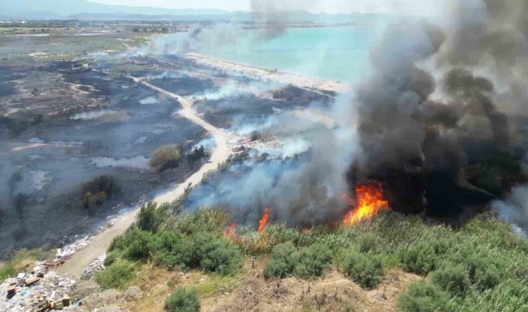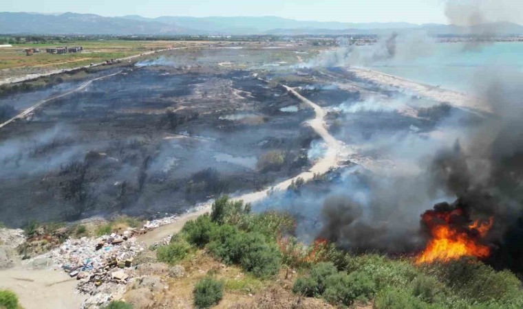 Altınkum Mahallesi Dalyan mevkiinde göçmen kuşların göç güzergahında bulunan denize yakın noktadaki sazlık alanda henüz belirlenemeyen bir nedenle 3 ayrı noktada yangın çıktı.