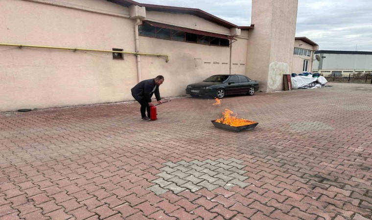 Eğitimin sonunda çalışanlar yakılan ateşi yangın söndürme tüpü ile söndürdüler.