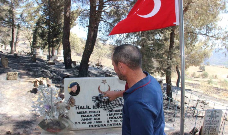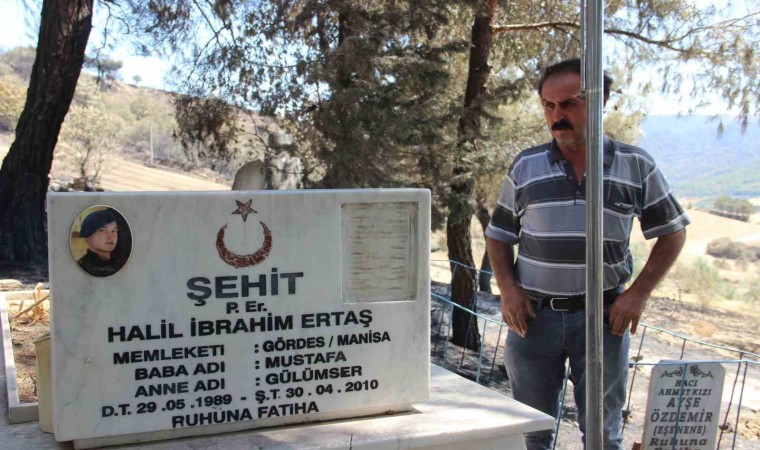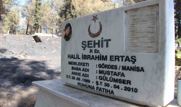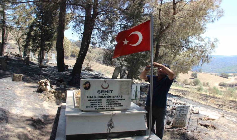 Manisa’nın Gördes ilçesinde 14 Ağustos’ta çıkan orman yangını 6. gününde tamamen kontrol altına alınarak soğutma çalışmalarına başlandı. Yangında tamamen yanan Gördes’in Karayakup köyü ve mezarlığında alevlerin uğramadığı tek nokta Şehit Halil İbrahim Ertaş’ın kabri ve Türk bayrağı oldu.