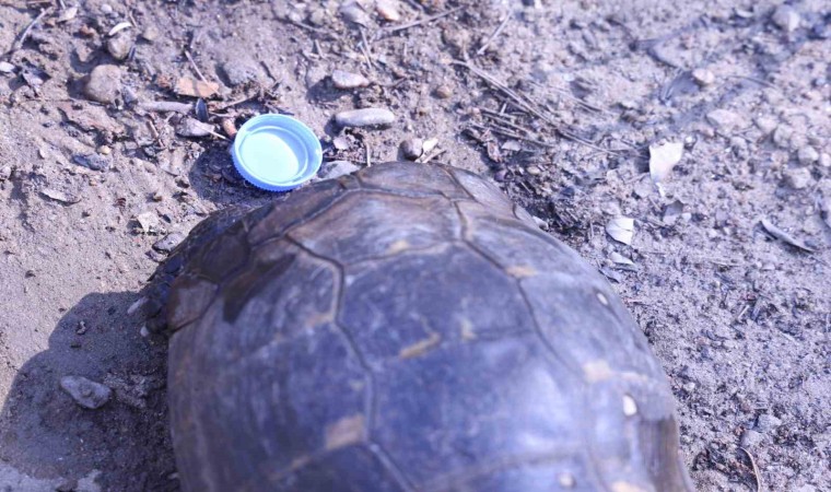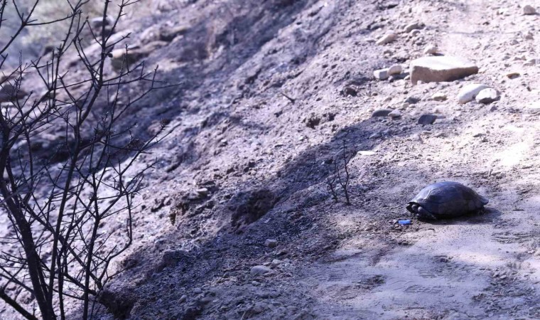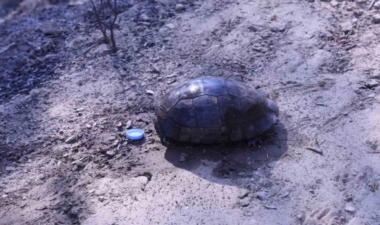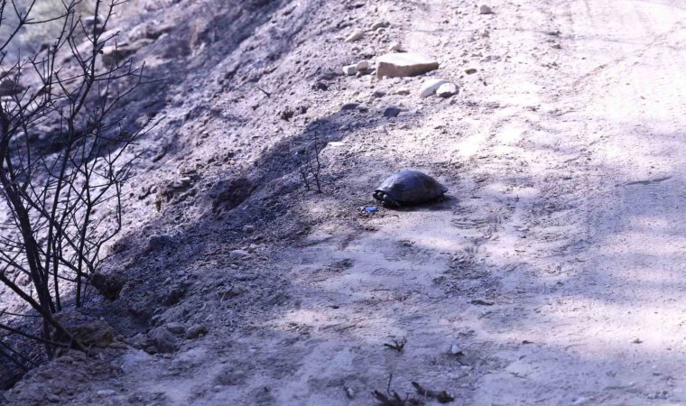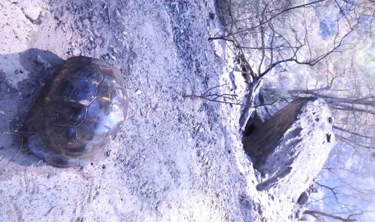 Muğla’nın Yatağan ilçesinde meydana gelen orman yangınından kurtulan bir kaplumbağa, bölgede görev yapan gazetecilere sığındı.