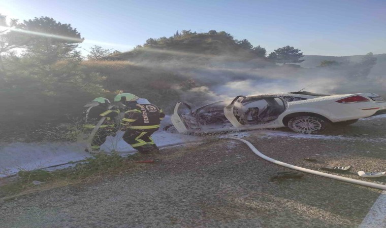 Denizli’de seyir halindeyken alev alan araç, kontrolden çıkarak şarampole devrildi.