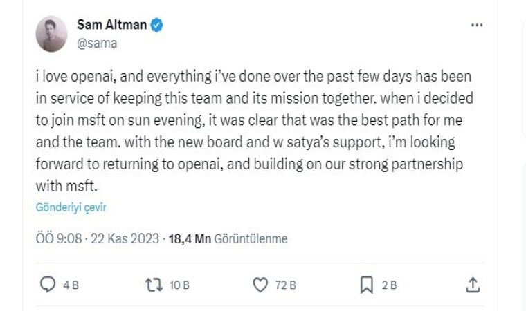 Altman, X (eski adıyla Twitter) üzerinden yaptığı açıklamada, "OpenAI’ı çok seviyorum ve son günlerde yaptığım her şey bu ekibi ve görevi bir arada tutmaya hizmet ediyordu. Pazar akşamı Microsoft’a katılmaya karar verdiğimde benim ve ekibim için en iyi yolun bu olduğu netti. Yeni yönetim kurulu ve Satya’nın (Nadella) desteğiyle, OpenAI’a dönmek ve Microsoft ile güçlü ortaklığımızı kurmak için sabırsızlanıyorum." dedi.