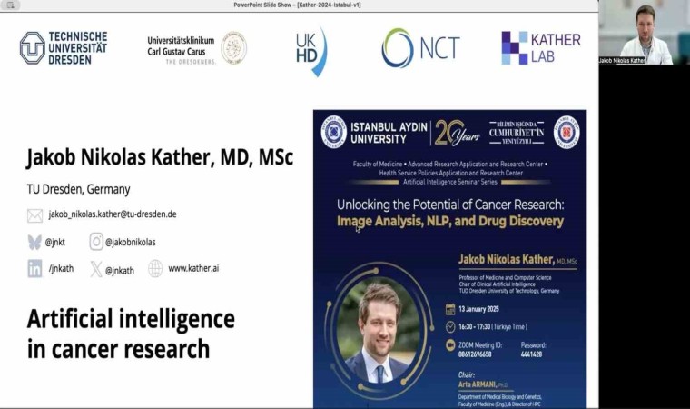 Alman Dresden Teknoloji Üniversitesi’nden Klinik Yapay Zekâ Anabilim Dalı Başkanı Prof. Dr. Jakob Nikolas Kather, webinarın onur konuğu olarak katılımcılara, YZ’nin kanser araştırmaları ve tedavisindeki dönüştürücü etkisini anlattı. Sunumu, İstanbul Aydın Üniversitesi Tıp Fakültesi Tıbbi Biyoloji ve Genetik Anabilim Dalı öğretim üyesi ve SPM Direktörü Dr. Arta Armani yönetti. Dr. Armani, etkinliğin açılışında, yapay zekânın sağlık sektöründeki artan önemine dikkat çekerek bu tür etkinliklerin bilimsel topluluğa katkısını vurguladı.