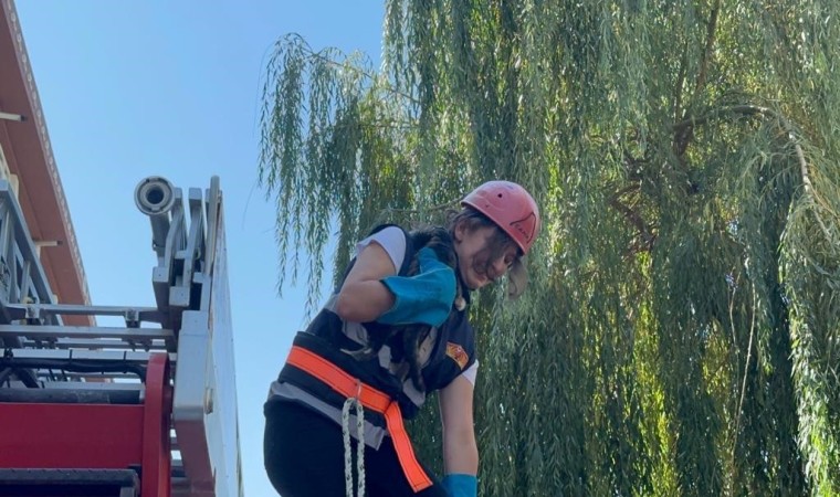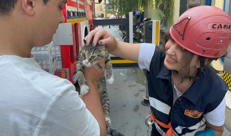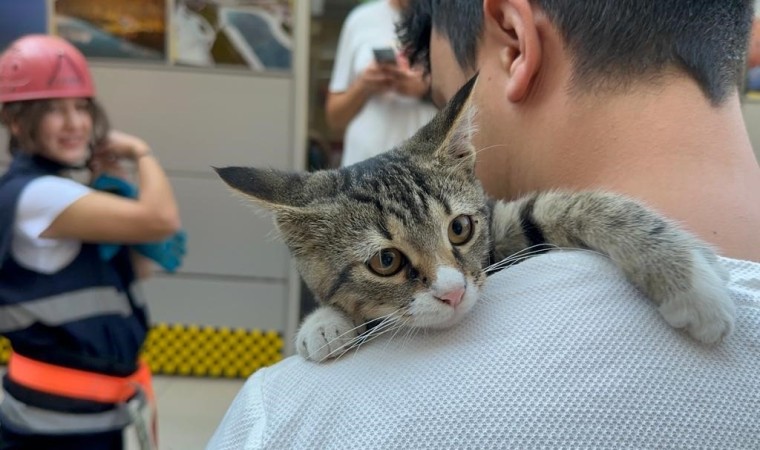 Yüksekten korkan kedi, bir süre kendisini kurtaran itfaiye personelini bırakmadı.