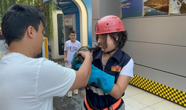 Bolu’da sabah saatlerinde yaklaşık 4 metre yüksekliğindeki ağaca tırmanan yavru kedi ağaçta mahsur kaldı. İtfaiye merdiveni ile ağaçtan alınan yavru kedi, korkarak kendisini kurtaran itfaiye personeline sımsıkı tutundu.