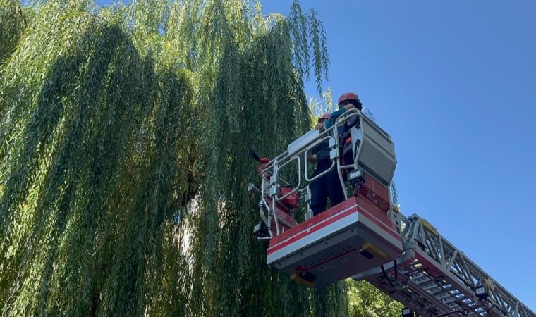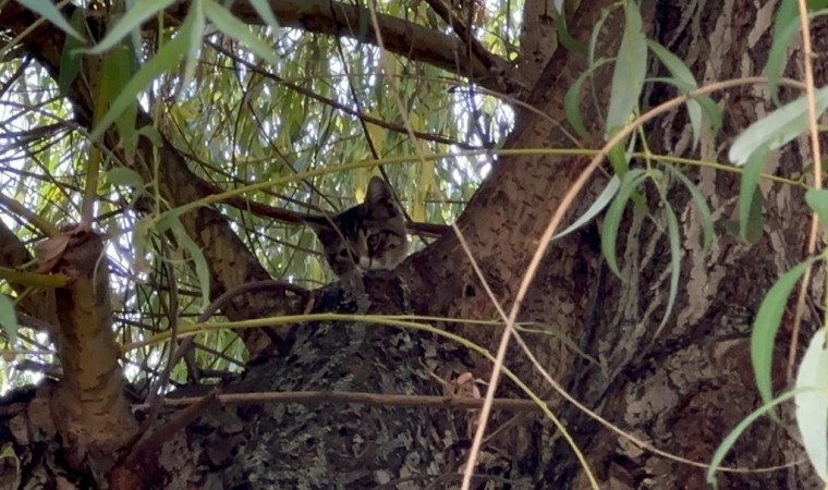 Oğluyla birlikte yoldan geçen Mustafa Yavuz, “Kedi ağaçta kalmış. Oğlumla beraber geçiyorduk. Çocuk merak etti. Ona bakıyoruz. İtfaiye birazdan kurtaracak” dedi.
