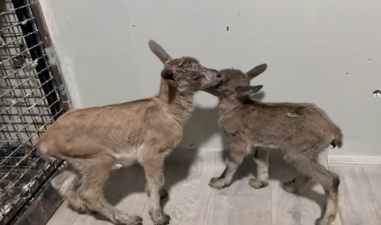 Erzurum’da vatandaşlar tarafından bulunan iki öksüz yavru yaban keçisi, şefkatli ellerde süt kardeşi olarak büyüyor.