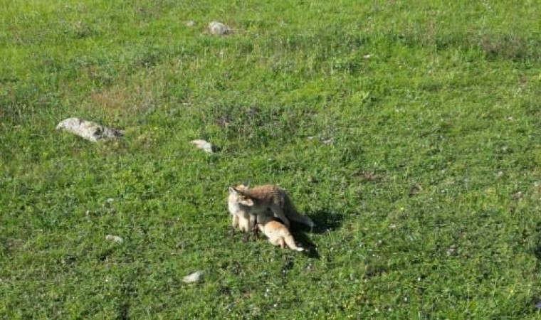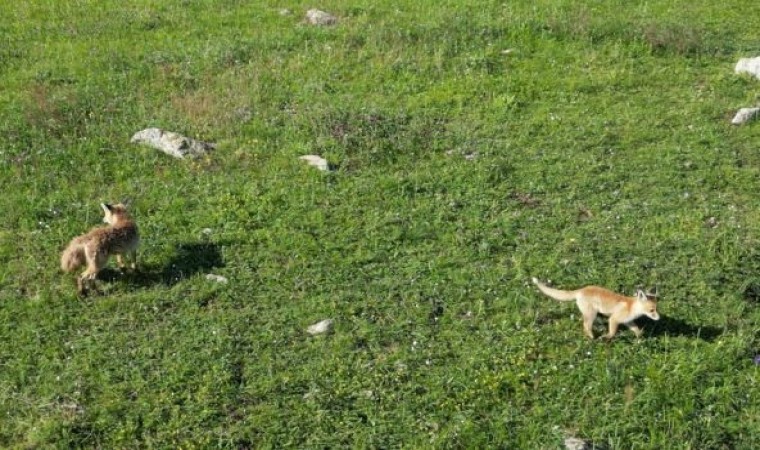 Tilkinin yavrularını emzirme anı dron ile kayıt altına alındı.