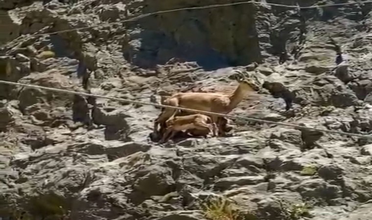 Erzincan’ın Kemaliye ilçesinde yavrularını emziren dağ keçisi, bölgeyi ziyaret eden yerli ve yabancı turistler tarafından görüntülendi.