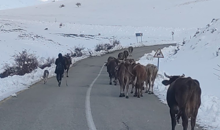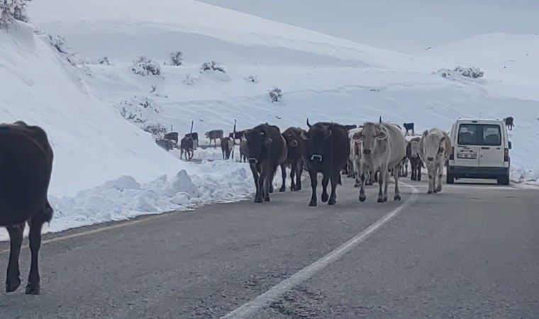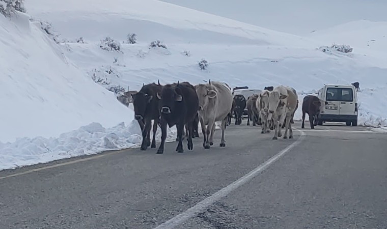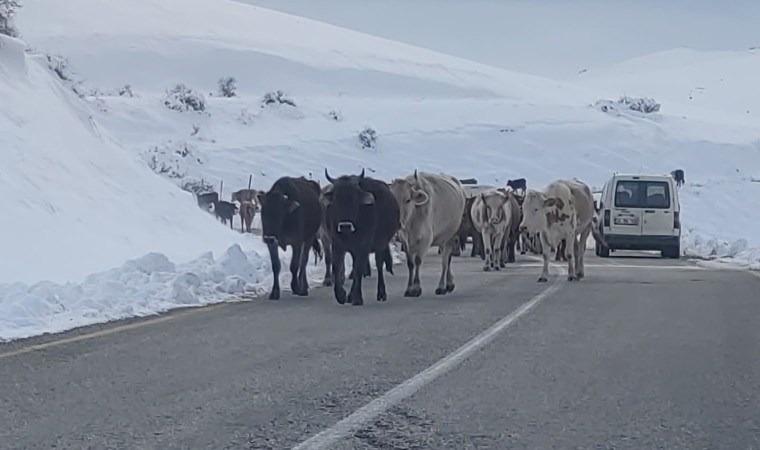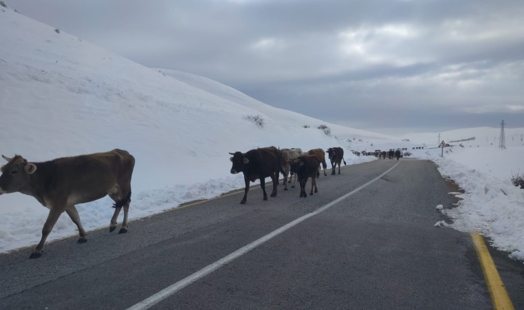 Mevsimin ilk karının beklenenden erken yağması sonucu köylerinin yaylasında mahsur kalan çiftçiler, bugün hayvanlarını ilçede bulunan ahırlarına doğru yola çıkardı.