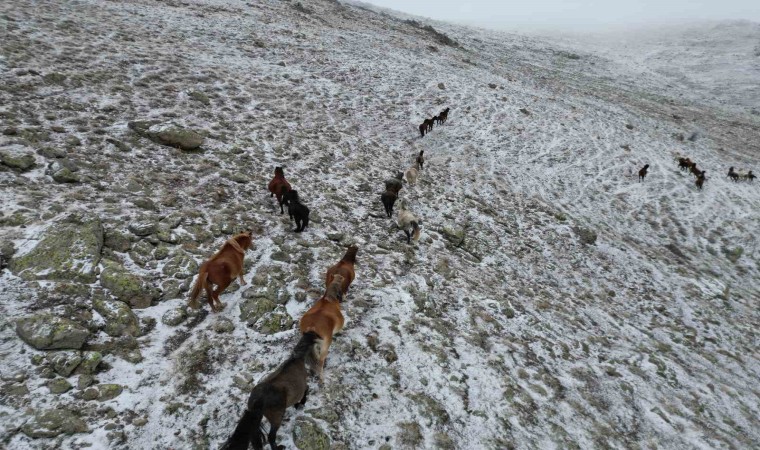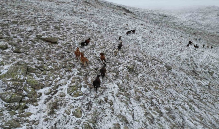 Afyonkarahisar’da ki yaylalarda kar altında yiyecek arayan yılkı atları dron ile havadan görüntülendi.
