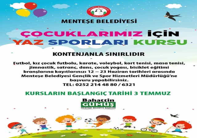 Menteşe'de sağlıklı bireylerin yetişmesine ve çocukların sporla ilgilenmelerine katkı sağlamak amacıyla açılan yaz sporları kurslarına kayıtlar başladı. Dans, karate, cimnastik, satranç, çocuk yogası, masa tenisi, kort tenisi, futbol, kız çocuk futbolu, bisiklet eğitimi ve voleybol gibi toplamda 11 farklı branşta açılan kurslar, 3 Temmuz 2023 tarihinde başlayacak.