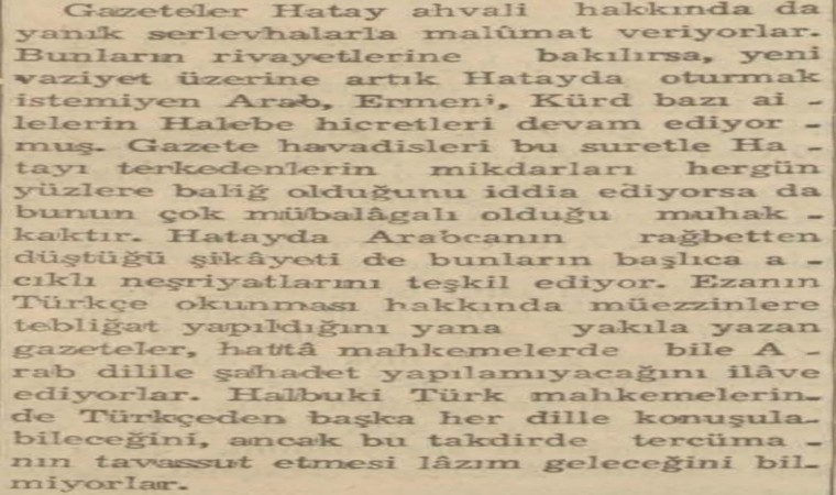 Mustafa Armağan, “Bu tabii, Türkiye ile birleştikten sonra Suriyelilerin yaşadığı büyük bir şoku beraberinde getirdi. O zamana kadar Fransız’ın dokunmadığı ezanı Türk askerinin yasaklaması ve Türkçe ezan diye bir metnin okunması için camiilere dikte edilmesi hadisesiyle karşılaştılar. Bu büyük bir şok oldu onlar için. Bu, Türkiye’de de oldu, Hatay’da da aynı şekilde bazı camilerde ezan Türkçe okununca vatandaşlar bunun kimin tarafından emir verildiğini bilmedikleri için müezzinleri kovaladıkları, imamları sopayla kovalayıp dövmeye çalıştığını, bazı yerlerde protestolar olduğunu ve biz bu ezanı istemiyoruz asıl ezanı istiyoruz diye protestolar yaşandığı belirtiliyor.”
