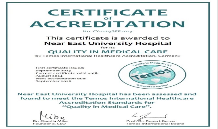 Uluslararası hasta bakımı ve yönetimi ile çalışan ve hasta güvenliği standartlarını takip eden Almanya merkezli bağımsız akreditasyon kurumu TEMOS tarafından denetlenen Yakın Doğu Üniversitesi Hastanesi “Quality In Medical Care” uluslararası akreditasyon sertifikasını alarak, sağlık hizmetlerindeki kalitesini tescil ettirmiş oldu. Güven, etkili tedavi ve optimize edilmiş sağlık hizmetlerinin ölçümlendiği TEMOS denetimi sonucunda, Yakın Doğu Üniversitesi Hastanesi TEMOS Uluslararası Kalite Standartlarını karşılayarak, “Tıbbi Bakımda Kalite Sertifikası” almaya da hak kazandı.