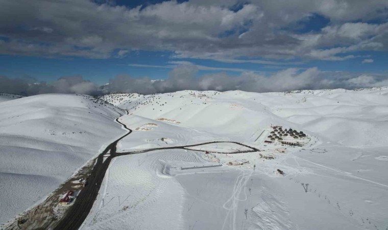 6 Şubat depremlerinin merkez üssü Kahramanmaraş’ta etkili olan sağanak yağmur, şehrin yüksek yerlerine kar şeklinde düştü. Şehir merkezine 20 kilometrede bulunan Yedikuyular Kayak Merkezi ise beyaz gelinliğini giydi.