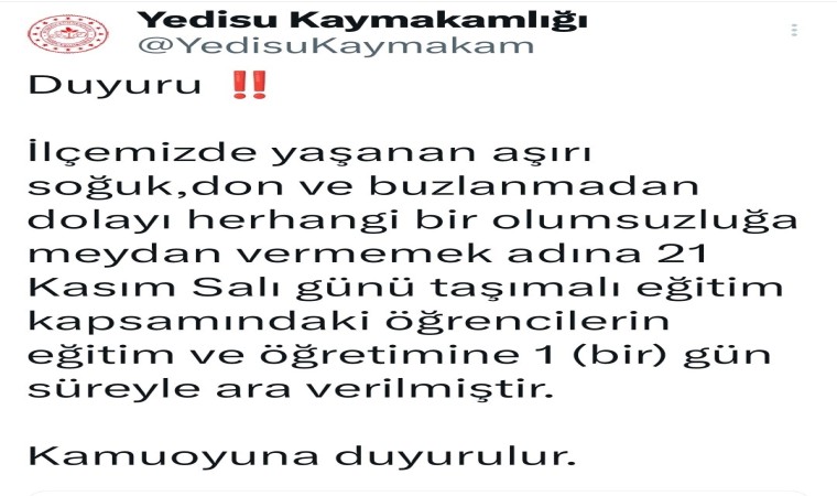 Bingöl’de dün başlayan yoğun kar yağışı nedeniyle Yedisu ilçesinde okullar pazartesi günü tatil ilan edilmişti. Yedisu Kaymakamlığı tarafından yapılan açıklamada, don ve buzlanma nedeniyle taşımalı eğitime bir gün ara verildiği duyuruldu. Açıklamada, "İlçemizde yaşanan aşırı soğuk, don ve buzlanmadan dolayı herhangi bir olumsuzluğa meydan vermemek adına 21 Kasım Salı günü taşımalı eğitim kapsamındaki öğrencilerin eğitim ve öğretimine bir gün süreyle ara verilmiştir" denildi.