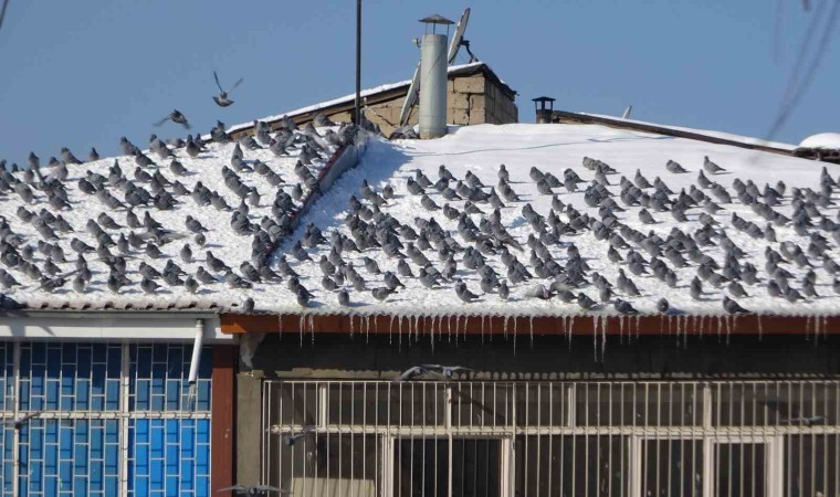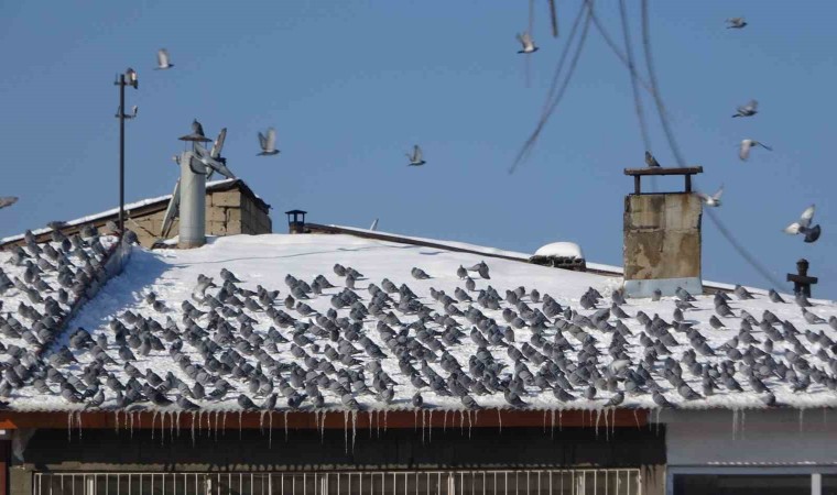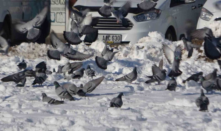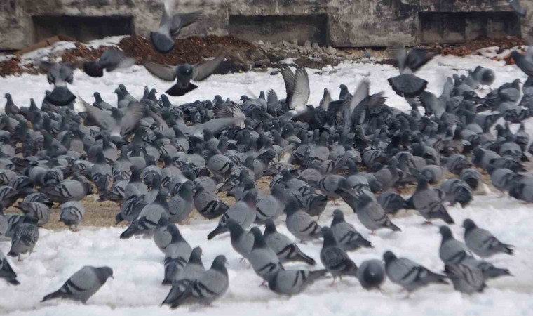 Van’ın İpekyolu ilçesindeki Ahmed-i Hani Kültür Parkı çevresindeki binaların çatı katlarını barınak edinen güvercinlerin kar yağışı altında atılan yeme akın etmesi görsel şölen oluşturuyor.