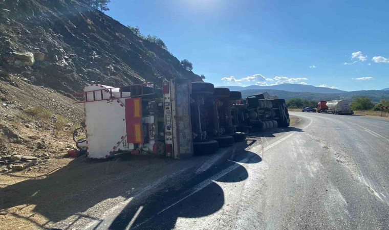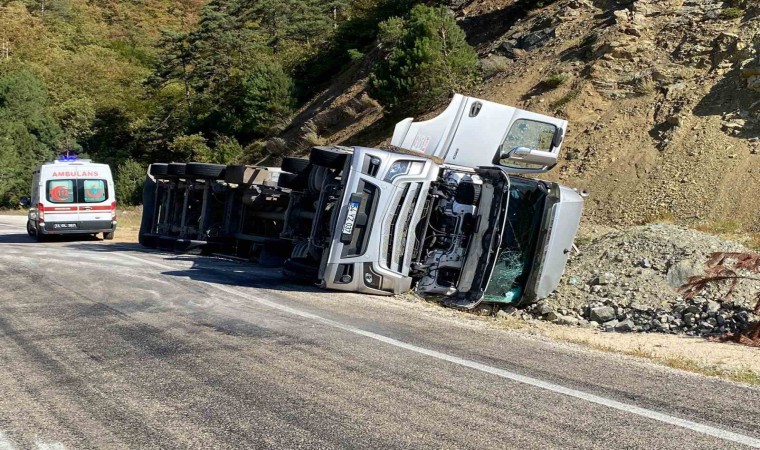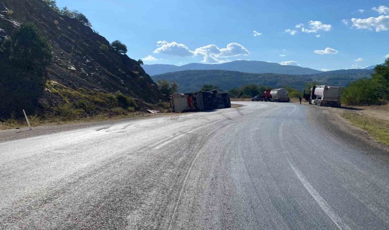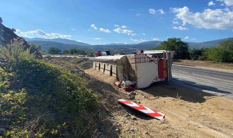 Bolu’da virajı alamayan yem yüklü tır, dorsesiyle beraber yol kenarına devrildi.