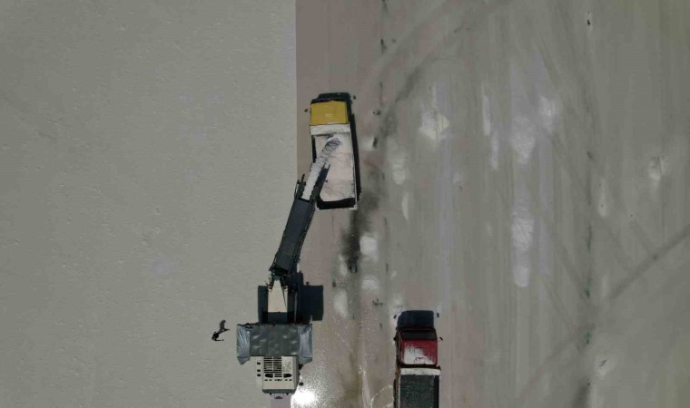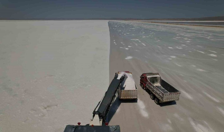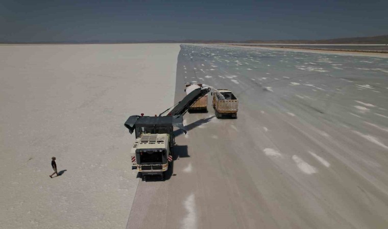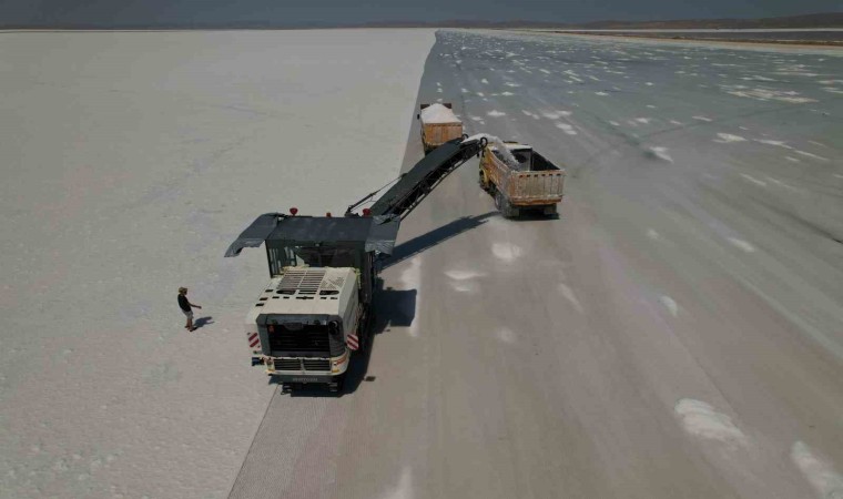 Kışın yeraltı sularının göl yüzeyine yükselmesinin ardından konsantrasyonu yüksek hale gelen suyun rüzgar ve güneş ile göl yüzeyine çökmesiyle beraber hasada başlanıldığını belirten Ham Madde Üretim Müdürü Yusuf Doğan, “Çöken tuzun asfalt kazıma makinesiyle belli oranda kamyonlara yüklüyoruz. Kamyonlarla stok sahalarımıza sevki sağlanıyor. Daha sonra burada istif yapıyoruz. Bunu yapmamızın sebebi de yıl içerisinde 3 ila 3 buçuk ayı tuz üretimi yapabiliyoruz. Diğer aylarda da yapılabilir ama tuzun kalitesini etkilediği için bunu tercih etmiyoruz” ifadelerini kullandı.