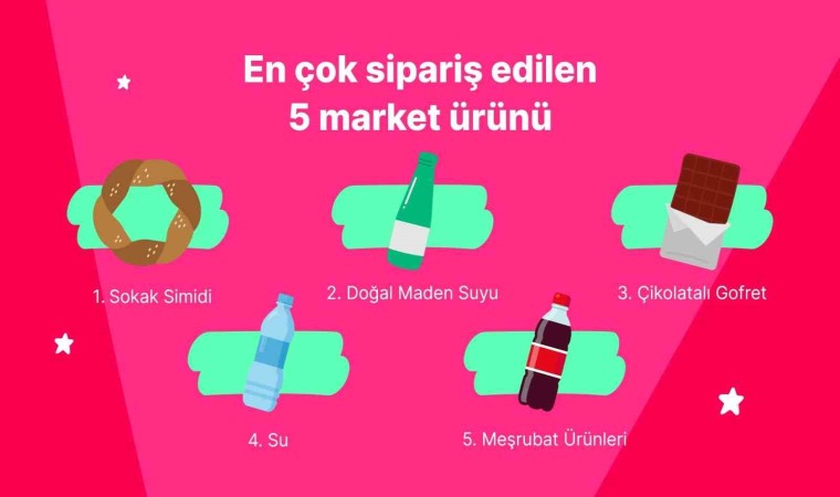 Yemeksepeti Market’te sokak simidi en çok tercih edilen ürün olurken, maden suyu ve çikolatalı gofret gibi günlük tüketim ürünleri de listeye girdi. Mahalle kategorisinde ise beyaz ekmek, patates ve maydanoz siparişlerde ilk sıralarda yer aldı, temel gıda ürünlerinin tüketiciler için vazgeçilmez olduğunu bir kez daha gösterdi. 2024’te en çok sipariş edilen ürünler: