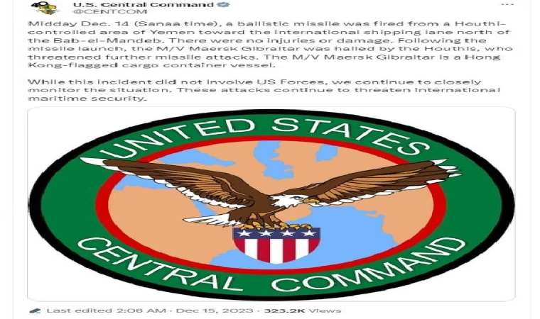 CENTCOM açıklamasında geminin deniz taşımacılığı şirketi Maersk’e ait olduğunu belirterek “14 Aralık öğle saatlerinde (Sanaa saatiyle) Yemen'de Husilerin kontrolündeki bir bölgeden Bab-el Mendeb'in kuzeyindeki uluslararası nakliye şeridine doğru bir balistik füze fırlatıldı. Olayda herhangi bir yaralanma ya da hasar meydana gelmemiştir. Füzenin fırlatılmasının ardından M/V Maersk Gibraltar gemisine Husiler tarafından daha fazla füze saldırısı tehdidinde bulunuldu. M/V Maersk Gibraltar Hong Kong bandıralı bir kargo konteyner gemisidir.